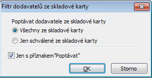 Po vyvolání funkce se zobrazí modální dialogové okno Filtr dodavatelů ze skladové karty, kde zadáte, jaké dodavatele chcete přidat. Zda všechny nebo jen schválené dodavatele a dále, zda všechny takové nebo jen ty z nich, kteří mají v položce Poptávat hodnotu Ano.