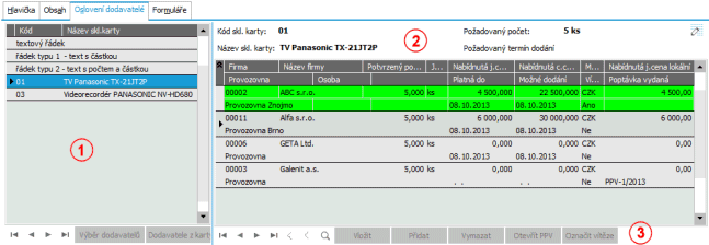 Příklad vzhledu subzáložky Oslovení dodavatelé. 1 - Seznam řádků z Obsahu s lištou navigátoru, 2 - Seznam oslovených dodavatelů k aktuálnímu řádku, 3- Lišta navigátoru seznamu oslovených dodavatelů