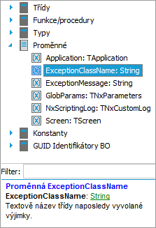 Zobrazení Class Exploreru Slouží pro přehledné zobrazení (ve formě hierarchického stromu) existujících tříd, funkcí, typů, proměnných, konstant a GUID identifikátorů BO s podporou filtrování pro rychlé dohledávání. Význam a použití jednotlivých prvků je pro implementátora skriptování znalého Delphi zřejmý. Pokud máte zadán nějaký řetězec do filtru, jsou zobrazeny jen záznamy vyhovující danému filtru, přičemž po rozkliknutí nějaké větve se nemusí zobrazovat její podsekce. Pokud je chcete zobrazit, filtr si zrušte. Zobrazuje k jednotlivým entitám příslušný doplňující popis, ve kterém fungují odkazy, které automaticky dohledají danou třídu/typ/... ve stromu. Pokud se v textu zobrazuje odkaz na předka objektu, na němž ve stromu uživatel stojí, a na tento odkaz uživatel klikne, provede se ve stromu skok na daný odkaz. Není ale k dispozici rychlá možnost vrátit se zpět na původní třídu, je třeba si ji opět ručně vyhledat ve stromu. Při editaci je k dispozici i klávesová zkratka Ctrl+F2 pro rychlé dohledání ve stromu (Class explorer). Viz tip pro vás s příkladem v popisu ovládání editoru v záložce Zdrojový kód. |