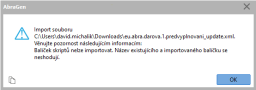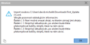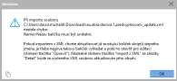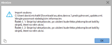 Akce provedení importu skriptů z XML. Zda dojde k importu nového balíčku skriptů nebo se aktualizuje balíček skriptů stávající, závisí na použitém režimu editace. V případě, kdy uživatel stiskne tlačítko Import z XML a není v režimu editace, bude balíček naimportován jako nový. V případě, že jeho název již bude v seznamu balíčků skriptů existovat, bude nutné nejprve upravit jeho název a poté uložit, jinak nebude možné nový skript uložit. Příklad importu, kdy název importovaného balíčku skriptů je shodný s již existujícím skriptem. Pokud potřebujeme importovat skutečně nový skript, je potřeba název upravit. Abychom mohli importovaný skript uložit jako nový, je potřeba upravit název balíčku skriptů. V tomto případě jsme do názvu balíčku skriptů doplnili "_B". Poté je možné již balíček uložit. V případě, kdy potřebujeme pouze aktualizovat stávající balíček skriptů, je nutné před stiskem tlačítka Import z XML zahájit režim editace. To provedeme tlačítkem Opravit nebo stiskem klávesy F4 na klávesnici. Poté tlačítkem Import z XML provedeme aktualizaci balíčku skriptů. Následně zobrazené okno informuje uživatele o stavu aktualizace. Příklad, aktualizace balíčku skriptů přes tlačítko Import z XML. Následně po aktualizaci je nutné provést novou kompilaci závislých řádků skriptu.