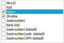| Rozlišovat velikost písmen | Položka je aktivní pouze, pokud byla zatržena též položka Používat pro omezení výběrů dat. Není k dispozici pro položky typu Poznámka a Poznámka (unicode). Hodnota tohoto parametru, jehož funkčnost je zřejmá z jeho názvu, slouží k předvyplní parametru Rozlišení velikosti písmen na záložce omezení (resp. Filtru či Hromadného označení). | |||||||||||||||||||||||||||||||||||||||||||||||||||||||||||||||||||||||||||||||||||