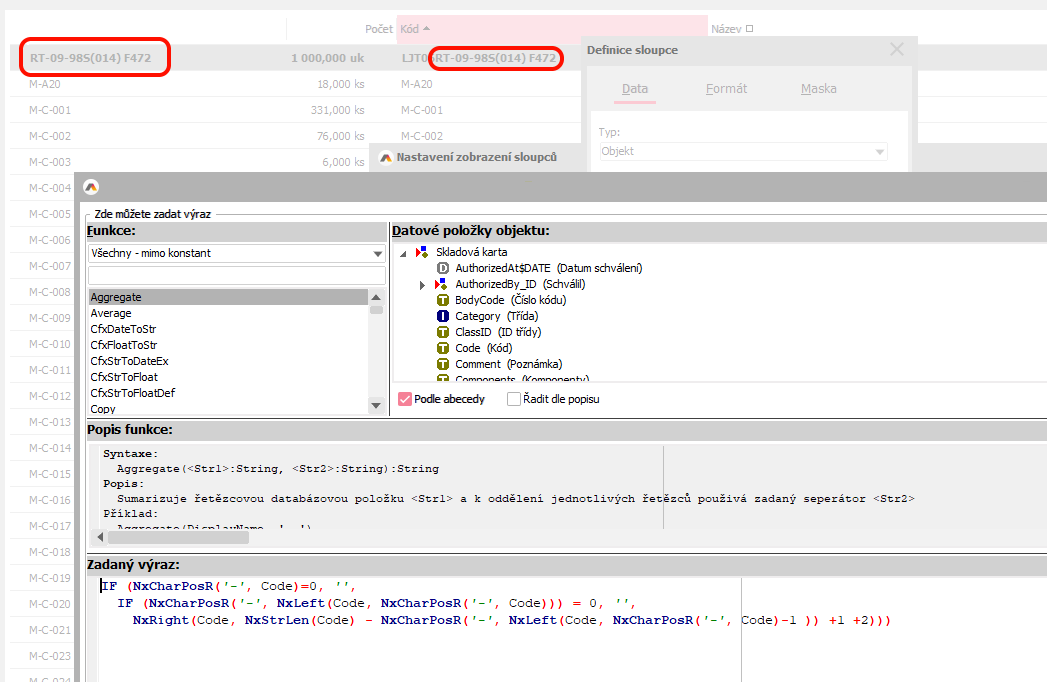 Výraz uvedený výše v tabulce lze vložit v agendě Skladové karty do vlastního sloupce, kde je následně vidět, na jaká slova se kód rozdělí.