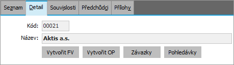 Vytvořit OP = otevře agendu faktur objednávek přijatých v režimu zadání nové objednávky a nastaví firmu Aktis a.s.