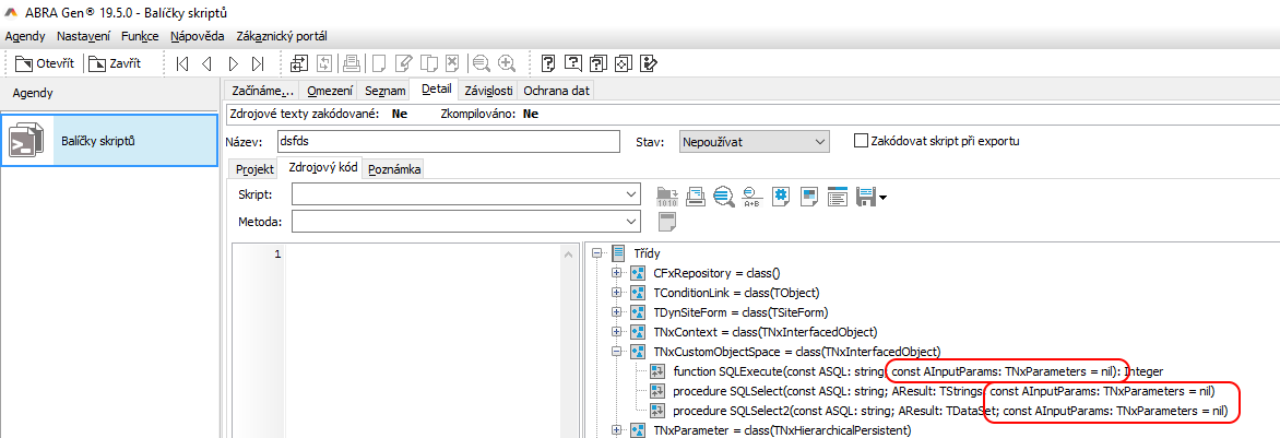 Od verze 19.4.3 je možné používat parametrizované SQL dotazy ze skriptování. Používání parametrů v SQL je snadnější, bezpečnější a pro SQL servery i rychlejší na vykonání díky cachování plánů SQL dotazů. Přes parametry lze snadno a bezpečně přenést libovolný datový typ, tedy i binary blob data.