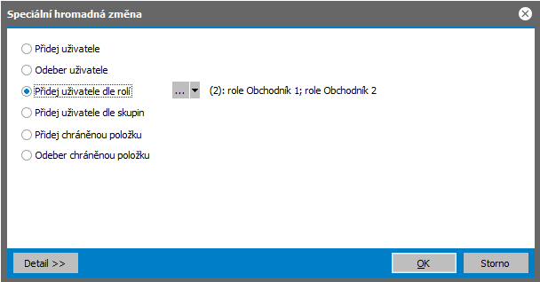 Viz též často kladení otázky, otázka Co když přijde do firmy nový uživatel? Slouží pro hromadnou opravu vybraných pevných položek (vybraných výrobcem) a dále těch uživatelsky definovatelných položek definovaných k třídě Business objektů dané agendy, které mají ve své definici nastaveno, že je lze hromadně opravovat, tj. mají zatržen příznak Hromadná změna. Pomocí hromadných oprav lze hodnoty přepisovat, přidávat, příp. i mazat. Viz též Možnosti hromadných oprav podle typu opravovaných položek a dále Mazání hodnot pomocí hromadných oprav. Je-li funkce v agendě k dispozici, nahrazuje funkci Hrom. oprava už. položek (protože pomocí Rozšířené hromadné opravy lze opravovat i uživatelsky definovatelné položky). Provede hromadně opravu podle zadaných hodnot na všech označených záznamech (není-li žádný označen, zpracuje aktuální záznam). Po vyvolání funkce se zobrazí dialogové okno s definovatelným výčtem hromadně opravitelných položek, kde lze zadat, jaké položky se mají opravit, na jaké hodnoty a v jakém počtu transakcí. Změny hodnot lze zadávat i výrazem, což značně zvyšuje možnosti využití této funkce. Tato možnost se nabízí pouze za předpokladu, že je v agendě Definice překladů vytvořena definice pro danou třídu. Slouží pro hromadnou opravu překladů položek, které byly v rámci definice překladů nadefinovány. Provede hromadně opravu podle zadaných hodnot na všech označených záznamech (není-li žádný označen, zpracuje aktuální záznam). Po vyvolání funkce se zobrazí dialogové okno. V něm uživatel vybere jazyk překladu a překládanou položku. Číselník jazyků a seznam pro výběr překládaných položek je zafiltrovaný podle jazyků použitých v definici překladů daného objektu. Hodnotu pro opravu zadá uživatel buď přímo do položky Nová hodnota, nebo lze zatrhnout volbu vpravo Použít výraz a vložit hodnotu výrazem. Výraz se vyhodnocuje vždy nad záznamy hlavního objektu. Po potvrzení dialogu se pro všechny označené záznamy hlavního objektu uloží nastavené hodnoty do příslušných položek překladů. Při zpracování se provádí kontrola na konkurenční přístupy (pesimistické zámky) hlavního objektu i každého upravovaného objektu překladů. Tato možnost se nabízí pouze za předpokladu, že je v agendě Skupiny parametrů vytvořena definice pro danou třídu. Slouží pro hromadnou opravu parametrů, které byly v rámci agendy Skupiny parametrů nadefinovány. Provede hromadně opravu podle zadaných hodnot na všech označených záznamech (není-li žádný označen, zpracuje aktuální záznam). Po vyvolání funkce se zobrazí dialogové okno. V něm uživatel vybere Skupinu parametrů a Definici parametru u které chce změnu provést. Definice jsou filtrovány jen za definice použité v dané skupině. Hodnotu pro opravu zadá uživatel buď přímo do položky Nová hodnota, nebo lze zatrhnout volbu vpravo Použít výraz a vložit hodnotu výrazem. Výraz se vyhodnocuje vždy nad záznamy hlavního objektu. Výsledek výrazu musí vždy odpovídat datovému typu definice parametru. U číselných položek je před uložením hlídán povolený rozsah dle nastavení v definici parametru. Pokud je potřeba jen hromadně vymazat stávající hodnoty, je třeba použít zatržítko s názvem Vymazat hodnotu. Po potvrzení dialogu se pro všechny označené záznamy hlavního objektu uloží nastavené hodnoty do příslušných položek definic parametrů Při zpracování se provádí kontrola na konkurenční přístupy (pesimistické zámky) hlavního objektu i každého upravovaného objektu parametrů. Slouží pro možnost hromadného připojení resp. odpojení příloh (dokumentů) k záznamům této agendy (jedná se o přílohy v záložce Přílohy dané agendy). Funkce provede hromadně danou akci (tj. připojení příloh nebo jejich odpojení) pro všechny označené záznamy (není-li žádný označen, zpracuje aktuální záznam). Funguje jen s přílohami, které jsou již ve stejnojmenné agendě u nějakého záznamu uloženy nebo které zatím nemají vlastníka (viz dále), tj. poslouží např. tehdy, pokud k vícero záznamům dané agendy chcete zadat množinu stejných příloh nebo pokud chcete určitou množinu příloh od opravovaných záznamů hromadně odpojit, jelikož např. už nejsou pro dané záznamy platné. Po vyvolání funkce se zobrazí dialogové okno podobné oknu s definovatelným výčtem hromadně opravitelných položek. Příklad hromadného přidání vybraných příloh k označeným záznamům dané agendy Oproti oknu s definovatelným výčtem hromadně opravitelných položek zde není možnost zadat novou hodnotu výrazem (jelikož zde nemá význam) a počet transakcí. Pomocí tlačítek Přidat a Vymazat z lišty navigátoru lze přidávat resp. ubírat jednotlivé řádky s určením příloh (dokumentů), které se mají k opravovaným záznamům dané agendy připojit nebo které se mají od opravovaných záznamů naopak odpojit, je-li zatrženo zatržítko "Vybrané přílohy odpojit". Na každém řádku je k dispozici číselníková položka pro zadání přílohy. Příloha se vybírá z agendy dokumentů (je to tedy obdoba funkce Připojit ze záložky Přílohy, tj. nabídne se Průvodce výběrem dokladu, pomocí něhož vyberete požadovaný dokument). Další možnost, jak přidat do dialogového okna seznam příloh, je načíst si je od jiných záznamů téže agendy a to pomocí volby Načíst z v liště navigátoru. Po vyvolání této volby se přes dialogové okno Hromadné připojení příloh otevře znovu aktuální agenda, tentokrát vyvolaná jakožto výběrový číselník, kde si můžete vybrat, z jakých záznamů si chcete přílohy načíst. Po stisku OK se z vybraných záznamů načtou příloh