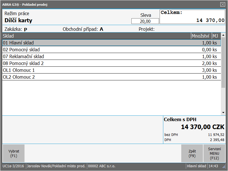 - Je-li v agendě Provozy nastaveno Automaticky prodávat z dalších prodejních skladů, pak se zobrazí dílčí karty z těchto skladů plus z výchozího prodejního skladu. Dílčí karta ale musí pro dané sklady samozřejmě existovat (tj. musí být na nich založena).