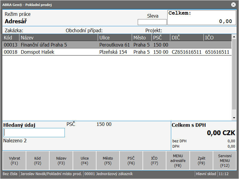 Prodavač zadá do pole Hledaný údaj nějaký identifikační údaj pro dohledání zákazníka a stiskne odpovídající tlačítko (F2 - vyhledávání podle kódu, F3 - podle názvu, F4 - ulice, F5 - město, F6 - PSČ, F7 - IČO). Případně si můžeme otevřít adresář firem (přes MENU adresáře F8) a vybrat zákazníka z agendy.