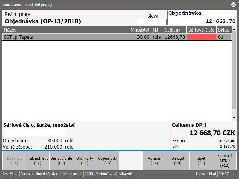 - Nakonec použije funkci Dokončit F1. Kasa vloží obsah objednávky do účtenky a vrátí se do režimu Prodej.