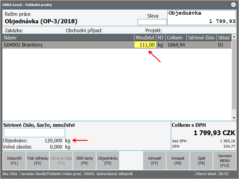 Prodavač najde příslušný řádek a množství upraví, případně smaže F8.