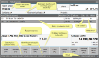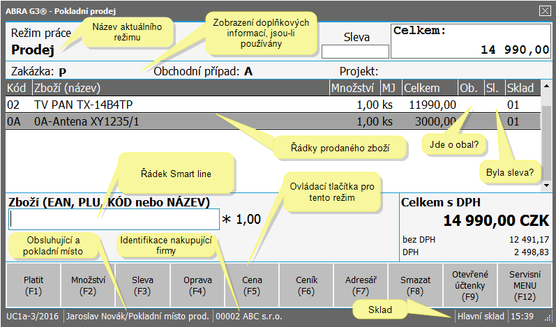 Prodej se provádí prostřednictvím vstupní řádky "Smart line" a ovládacími tlačítky resp. odpovídajícími řídícími klávesami. Vedle vstupní řádky se zobrazuje informace o zadaném násobku prodávané položky (viz dále Příkazy pro prodej) a informace o poslední prodané položce a případně její skladová zásoba.