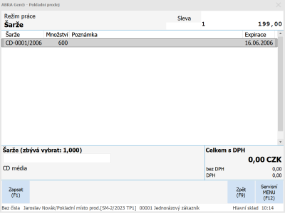 Na jednom řádku účtenky lze zadat pouze jednu šarži. Při prodeji se postupuje takto: