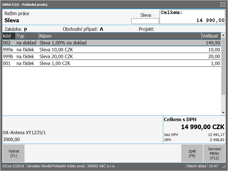 - Slevu poskytovanou ručně na řádek účtenky vyberte jejím zaostřením v seznamu stiskem kurzorových kláves (šipky nahoru/dolů). Slevu vyberte ve chvíli, kdy jste příslušné zboží právě prodali.