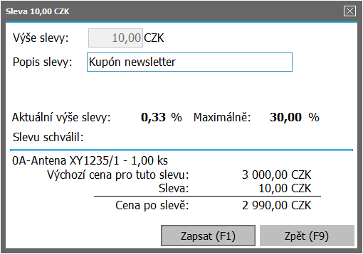 Vybere zaostřenou slevu a zobrazí dialogové okno Sleva zobrazující ceny před a po slevě a umožňující zapsat Popis slevy (není povinný). Výši slevy lze měnit tehdy, pokud jde o typ slevy, který má nastaveno "Výši slevy může upravit obsluhující". Dialogové okno Sleva - příklad zobrazení Použití dané slevy potvrďte stiskem klávesy Zapsat (F1 nebo Enter). Po potvrzení tohoto dialogu se sleva zapíše a program se přepne zpět do režimu Prodej. Pokud nemá obsluhující dostatečně vysokou maximální slevu, zobrazí se dialog potvrzení slevy jiným obsluhujícím, který takovou možnost má. Tj. má ve svých nastaveních nastavenu dostatečnou maximální slevu a má oprávnění Autorizovat poskytované slevy . |