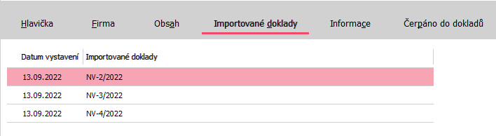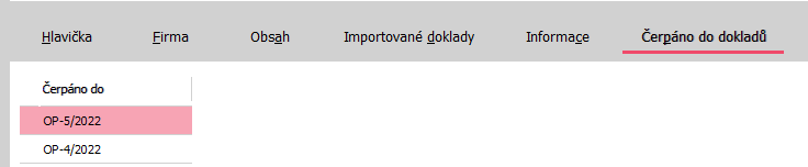 | Obsažené subzáložky: | Hlavička | Firma | Obsah | Importované doklady | Informace | Čerpáno do dokladů | Formuláře |