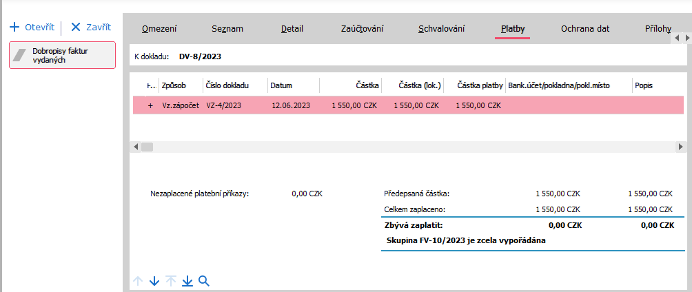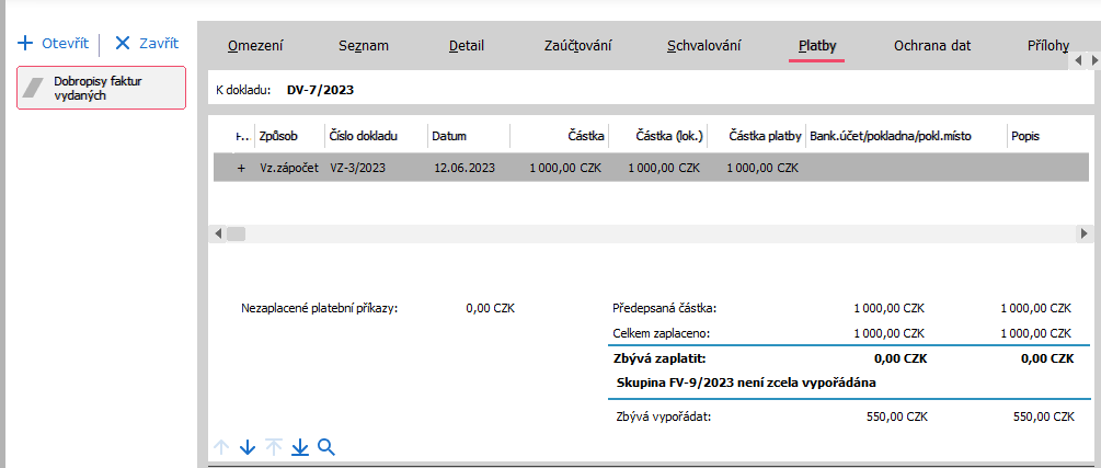 Na řádek se zápočtem DV ("závazek") se také uloží odkaz na započítávanou FV. Ten se použije při zaúčtování. Objasníme na příkladech: Mějme FV na 1550,- bez platby. Dobropisováno 1000,-. K úhradě na FV tedy zbývá 550,-, Celá skupina FV-DV je nevyrovnaná, na FV zbývá uhradit 550,-. Dobropis se tváří jako neuhrazený ve výši svého předpisu, tj. 1000,-. Pokud se vystaví VZ, vygeneruje se na 1000. Dobropis se poté bude tvářit jako plně uhrazený, za skupinu je třeba vypořádat 550,-: Mějme FV na 1550,- bez platby. Dobropisováno 1550,-. K úhradě na FV tedy zbývá 0,-, Nechť je DV poté zaplacen částečně pokladnou ve výši 1000,-. Celá skupina FV-DV je tedy znovu nevyrovnaná ve výši 1000,-. Dobropis se tváří jako neuhrazený ve výši svého předpisu mínus platby, tj. 550,-. Pokud se vystaví VZ, vygeneruje se na 550, tedy započte se zbylá nezaplacená částka z DV (více nelze započítat).Dobropis se poté bude tvářit jako plně uhrazený, za skupinu je třeba vypořádat oněch zbytečně zaplacených 1000,-: |