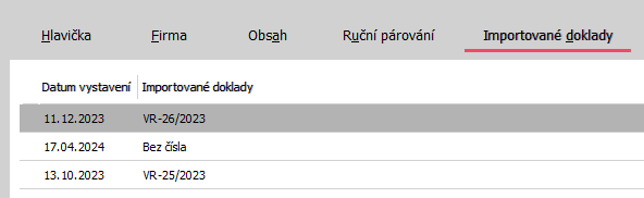 | Obsažené subzáložky: | Hlavička | Firma | Obsah | Šarže/s.čísla | Rozúčtování | Ruční párování | Texty | Importované doklady | Formuláře |