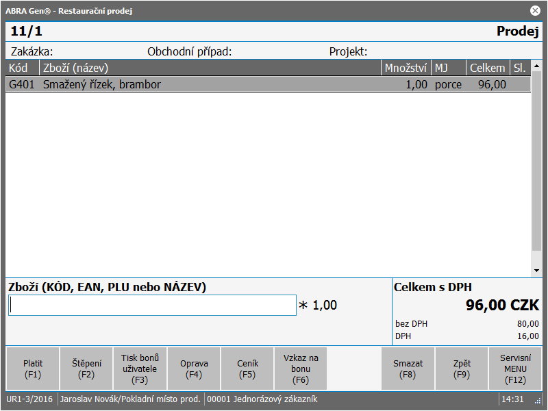 - Po vstupu na účet obsluha připíše pomocí některého z dále popsaných příkazů přes vstupní řádku zboží v požadovaném množství na účet. Zadaný prodej se zobrazí v seznamu na obrazovce. Takto obsluha namarkuje vše, co na daném prodejním místě host objednal. Na obrazovce se průběžně vyčísluje celková hodnota namarkovaného zboží.