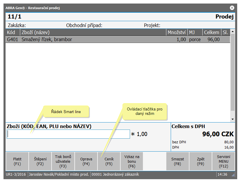Hlavní činnosti na kase (od otevření účtu hosta, přes zadávání prodejů - objednávek hostů, až po uzavírání účtů a zpracování plateb hostů) se provádějí pomocí jednoduchých příkazů vkládaných do "chytré" vstupní řádky (tzv. "Smart line"). Vstupní řádka "Smart line" v kombinaci s řídícími klávesami, resp. tlačítky a případně se snímačem čárových kódů pak umožňuje jednoduché a rychlé vykonávání všech operací souvisejících s obsluhou účtů hostů a prodejem zboží (markování, tisk bonů, opravy, storna, placení i tisk účtenek).