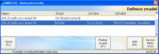 - Volbou Zrcadlo ze Servisního menu restaurační kasy.