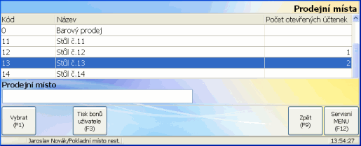 Režim Prodejní místa na kase restauračního prodeje je režim, který zobrazuje seznam prodejních míst, která jsou v rámci systému definována pro odpovídající Provoz, do něhož patří příslušná kasa (viz Nastavení kas) a umožňuje jejich výběr. Jsou zde uvedena jen předem zadaná prodejní místa. Židle, tak jak jsou popsány v kapitole Otevřené účty, zde nejsou a ani nemohou být uvedeny, protože jejich označení vzniká na pokyn uživatele a trvá jen tak dlouho, dokud je otevřená účtenka, na kterou jsou vázána. Ovládá se dále popsanými příkazy za použití řídících kláves.