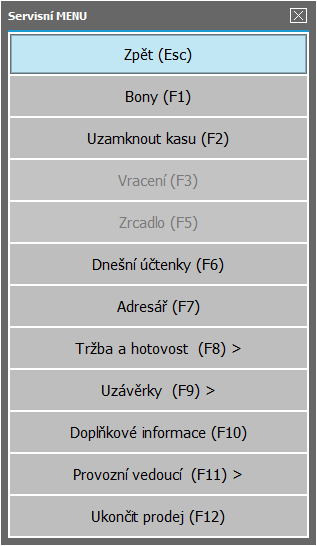 Servisní menu na restaurační kase. Sdružuje příkazy, které se nevykonávají pravidelně, ale jen občas. Z této nabídky lze např. ukončit prodej (zavřít kasu), odhlásit uživatele, přejít do režimu vracení zboží zákazníkem, zobrazit dnešní účtenky, vyvolat dialogy pro výběr nebo vklad hotovosti atd.