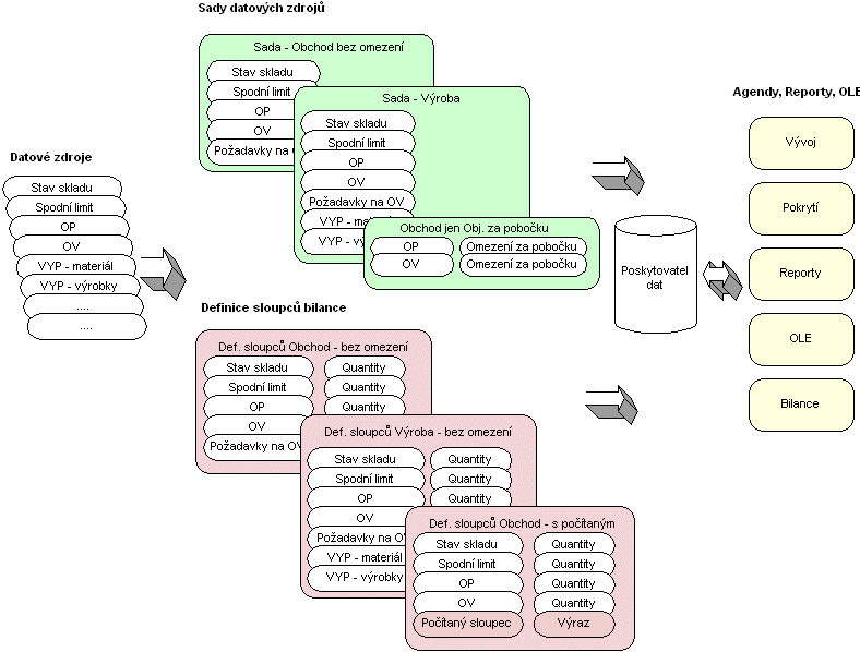 Nad těmito všemi daty poskytovatel pro každý nadefinovaný sloupec bilance vytváří v paměti dočasnou tabulku (např. jedna tabulka pro sloupec zobrazující množství (Quantity) z OP, druhá pro totéž z OV apod.). Při tvorbě této tabulky se již uplatní omezení datového zdroje zadané v záložce Omezení v definici sloupců bilance.