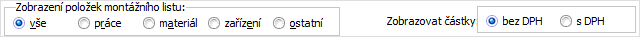 Nad seznamem je k dispozici panel, v němž si můžete zvolit, zda chcete v řádcích ML zobrazit všechny položky ML anebo zda chcete zobrazit jen položky nějakého typu (např. jen materiály). K tomu slouží první část omezovacího panelu (lišty). Pomocí druhé části panelu si můžete zvolit, zda chcete položky v řádcích ML zobrazovat v cenách s DPH nebo bez DPH: