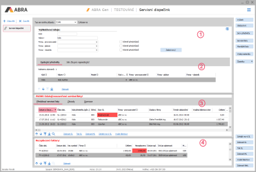 Příklad vzhledu dispečinku pro Typ servisního případu "Skladová karta se SČ" pro Opravnu elektroniky s variantním formulářem v továrním nastavení. 1 - Panel vyhledávacích údajů, 2 - Seznam nalezených záznamů, 3 - Seznam servisních listů, 4 - Seznam nezaplacených faktur