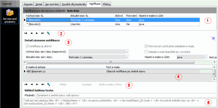 Jedná se o prvek needitovatelný seznam, v němž je zobrazen seznam dosud nadefinovaných notifikací pro daný servisovaný předmět. Význam položek zde zobrazených je zřejmý z jejich názvu, příp. plyne z popisu uvedeného dále.