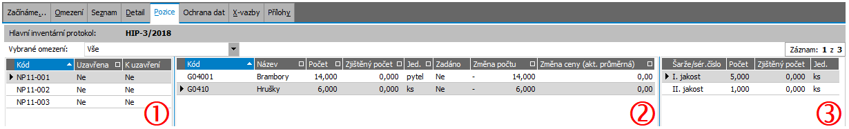 Příklad vzhledu této záložky. 1 - Seznam inventarizovaných pozic, 2 - Obsah pozice, 3 - Šarže/sér. čísla