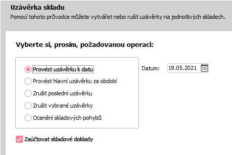 Uzávěrka skladu - Výběr požadované akce