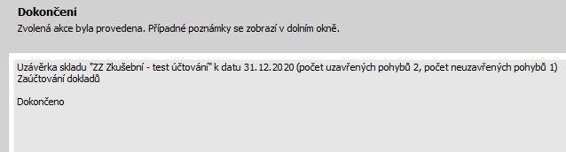 Po stisku tlačítka Dokončit v předchozím kroku se uzávěrka k zadanému datu začne provádět. Tj. začnou se oceňovat skladové pohyby dosud neoceněné a ocení se pohyby, které lze ocenit. Podrobněji viz vlastní algoritmus výpočtu skladových cen. Uzávěrka k datu poté vypíše závěrečnou informaci o tom, zda se všechny pohyby podařilo ocenit, příp. počet pohybů, které se ocenit nepodařilo.