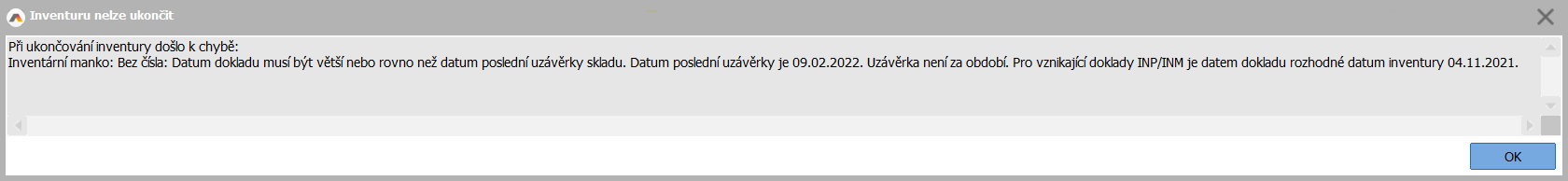 Mohou nastat případy, kdy při uzavření Hlavního inventárního protokolu nastane konflikt. Například je Rozhodné datum inventury menší, než datum poslední skladové uzávěrky.