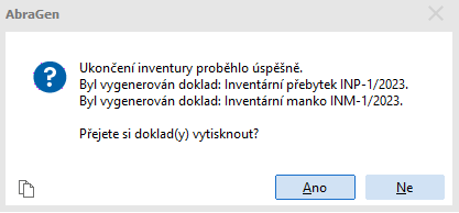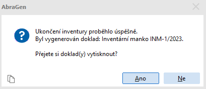Na závěr se zobrazí informační hlášení, zda se inventuru podařilo úspěšně ukončit, včetně možnosti tisku inventárních dokladů (pokud byly při ukončování inventury nějaké vygenerovány). Pokud se vygeneruje několik dokladů stejného typu (například několik dokladů typu inventární manko nebo inventární přebytek při provádění neblokační průběžné inventury), vytisknou se všechny doklady tohoto typu hromadně v rámci jedné tiskové sestavy.