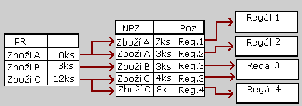 Schéma uskladnění 3 druhů zboží z příjemky (PR) celkem do 4 regálů, kdy zboží A jde do dvou regálů 1 a 2, zboží B do regálu 3 a část zboží C se ještě umístí do regálu 3 a zbytek do regálu 4. V tomto případě tedy bude NPZ doklad obsahovat 5 řádků.
