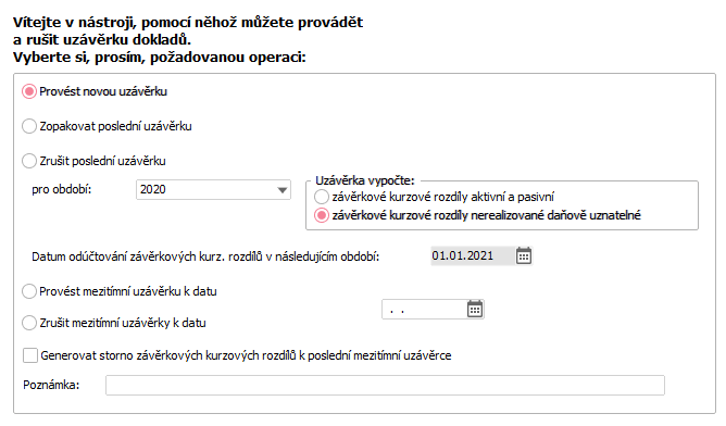 Provést mezitímní uzávěrku k datu - Program umožní zadat datum, ke kterému se provede mezitímní uzávěrka řad fakturačních dokladů, tj. vygenerují se nerealizované kurzové rozdíly fakturačních dokladů k zadanému datu. Položka se předvyplňuje aktuálním datem. Na zvoleném datu závisí, jaké řady fakturačních dokladů se nabídnou v následujícím kroku průvodce k uzavření. Dále lze zadat upřesňující poznámku.