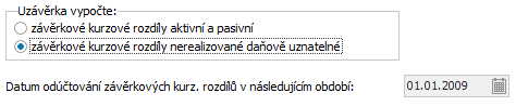 Pro volbu výpočtu závěrkových kurzových rozdílů aktivních a pasivních v předchozí položce je navíc k dispozici k editaci ještě položka pro zadání data odúčtování párových závěrkových kurzových rozdílů aktivních/pasivních v následujícím období. Předvyplňuje se prvním dnem období následujícího po uzavíraném. Datum z této položky se přenáší na vytvářené doklady závěrkových kurzových rozdílů jako datum účtování. |