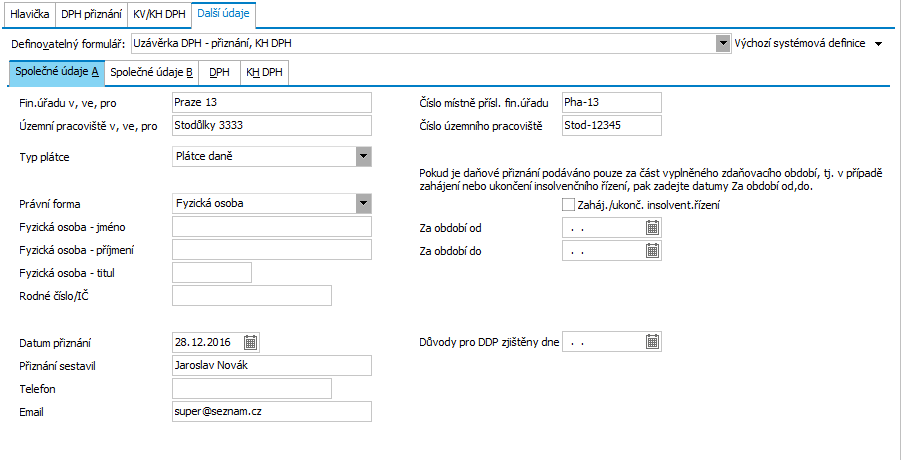 V této subzáložce je možné prostřednictvím zvoleného definovatelného formuláře zadat doplňkové údaje potřebné pro sestavení DPH přiznání resp. KV DPH/KH DPH či OSS. Jedná se např. o položky Oddílu A a B (zástupce, Jméno FÚ, ….) DPH přiznání.