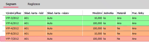 Záložka Seznam slouží k zobrazení dokladů výrobní příkazy (VYP), které byly vybrány v agendě Výrobní příkazy nebo kterým náleží doklady PHV, které byly vybrány v agendě Příjemky hotových výrobků případně Skladové pohyby.