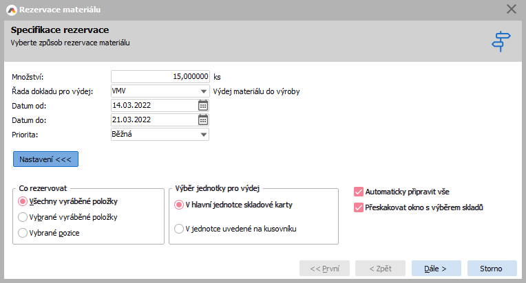 | Automaticky připravit vše | Pokud je parametr zatržen, pak se po přechodu na krok průvodce Seznam materiálu automaticky provede příprava všech položek. |