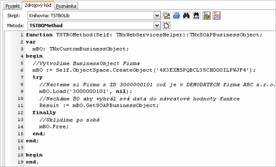 Ukázka jednoduché implementace operace, která vytvoří business objekt Firma, načte z databáze zadanou firmu (v našem případě firmu ABC s.r.o.) a jako výsledek celé operace vrátí TNxSOAPBusinessObject reprezentující tuto firmu.