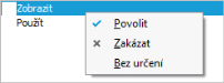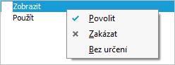 V pravé části záložky se zobrazují možná práva k tomuto objektu a to Zobrazit a Použít. Práva můžeme nastavit např. kliknutím pravým tlačítkem myši nad střediskem 100 v levé části záložky (čímž nastavíme obě práva najednou - obě na tutéž hodnotu) anebo kliknutím nad jedním z práv v pravé části záložky (čímž je nastavíme po jednom, pak je lze nastavit každé na jinou hodnotu). Hodnotu vybereme ze zobrazené nabídky:
