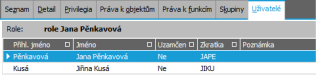 1. Ověříme si přiřazení rolí uživatelům. Otevřeme agendu Role. Viz modul Administrace→záložka Role a přístupová práva. U role Jiřina Kusá vstupte na záložku Uživatelé. Je v záložce následující seznam uživatelů?