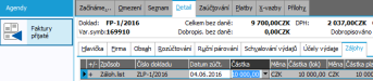 V záložce Zálohy jsou zobrazeny částky záloh zúčtovaných ze zálohových listů do aktuální faktury (může jich být samozřejmě více).