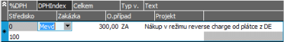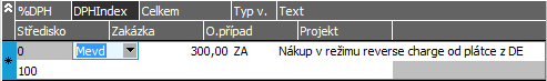 Příklad řádků faktury přijaté, DPH sazba je 0%, jiná sazba se u tohoto typu obchodu ani nenabízí, DPH index "Mimo evidenci DPH".