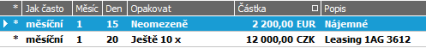 Pro tyto účely slouží agenda Opakované platby. Pro firmu z našeho zadaného příkladu si zadáme předpis na opakovanou platbu, např. na platbu nájemného za pronajaté kanceláře, které je placeno k 20-tému v měsíci ve výši 2200EUR z účtu naší firmy v EUR vedený v ČSOB. A poté na platbu leasingu za auto ve výši 12000CZK 15-tému v měsíci na účet naší firmy v CZK vedený v KB. Nakonec si vygenerujeme žádosti o platební příkazy.