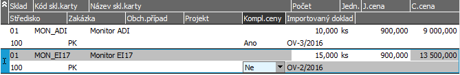 Zboží z OV-2/2016 i z OV-3/2016 však bylo dodáno jen částečně, tudíž z obsahu příjemky vymažeme 3. řádek a u 1. řádku upravíme dodaný počet na 15ks. Do 2. řádku doplníme cenu podle faktury přijaté FP-1/2016. Ale očekáváme ještě fakturu na dodatečné náklady (na dopravu), proto zadáme, že ceny pořízení jsou zatím nekompletní. Budou doplněny později. Na druhé zboží zatím fakturu nemáme, tudíž cenu zatím rovněž nezadáme. Bude doplněna později: