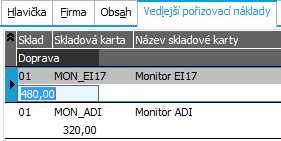 V záložce Vedlejších pořizovacích nákladů se zobrazují aktuálně k editaci jen ty druhy vedlejších pořizovacích nákladů, které se mají v hlavičce příjemky nastaveno, že se mají zadávat, v našem případě jen náklady na Dopravu.