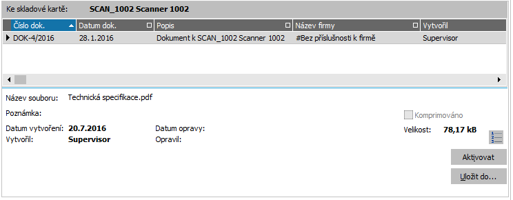 Nechť nám náš dodavatel k dodanému zboží zaslal i technickou specifikaci ve formě *.pdf dokumentu. Tu si připojíme ke skladové kartě SCAN_1002 jako její přílohu.