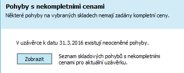 Pokud v uzavíraném období program najde příjmové doklady na sklad, které mají nezadané nebo nekompletní ceny, tak na tuto skutečnost upozorní s možností si je zobrazit: